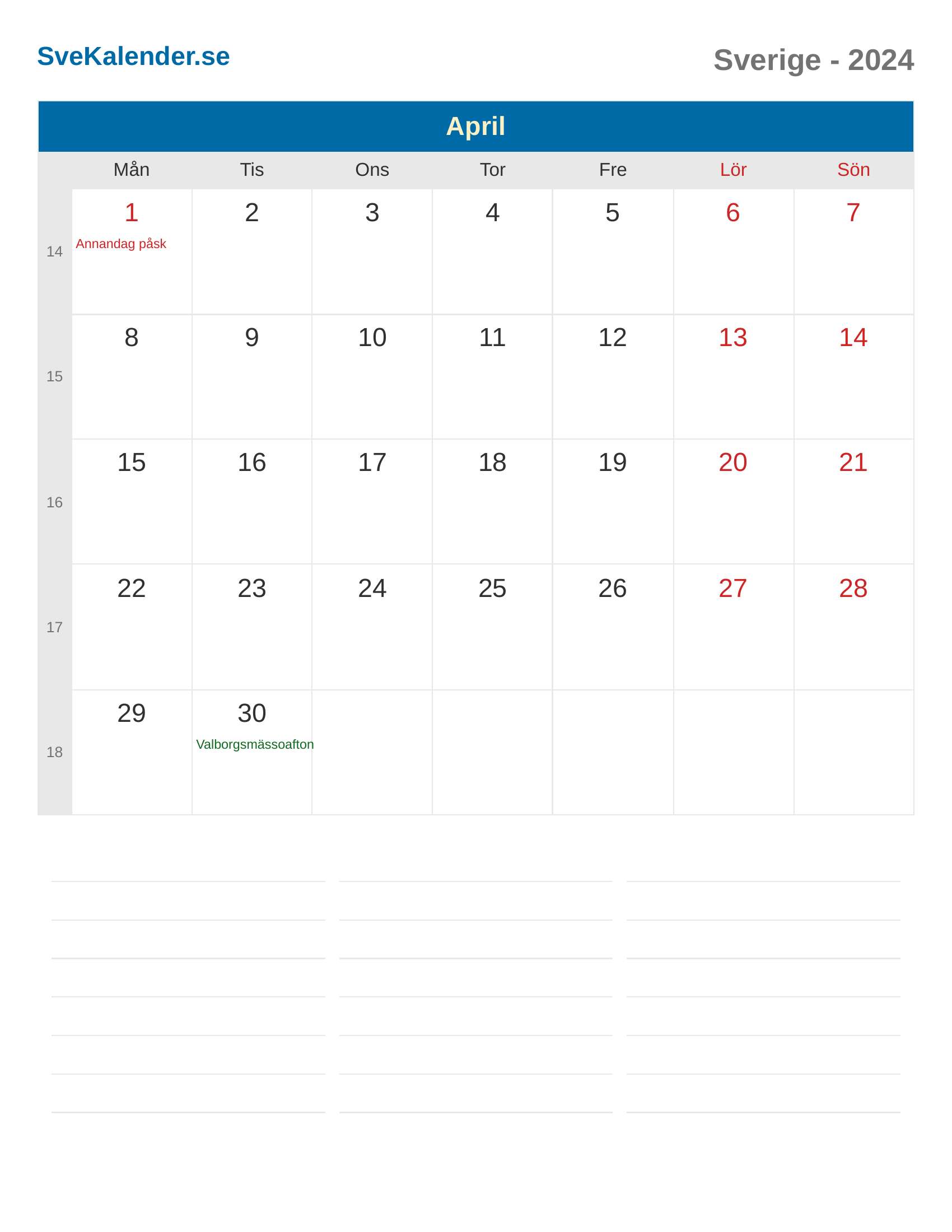 April 2024 kalender - Sverige