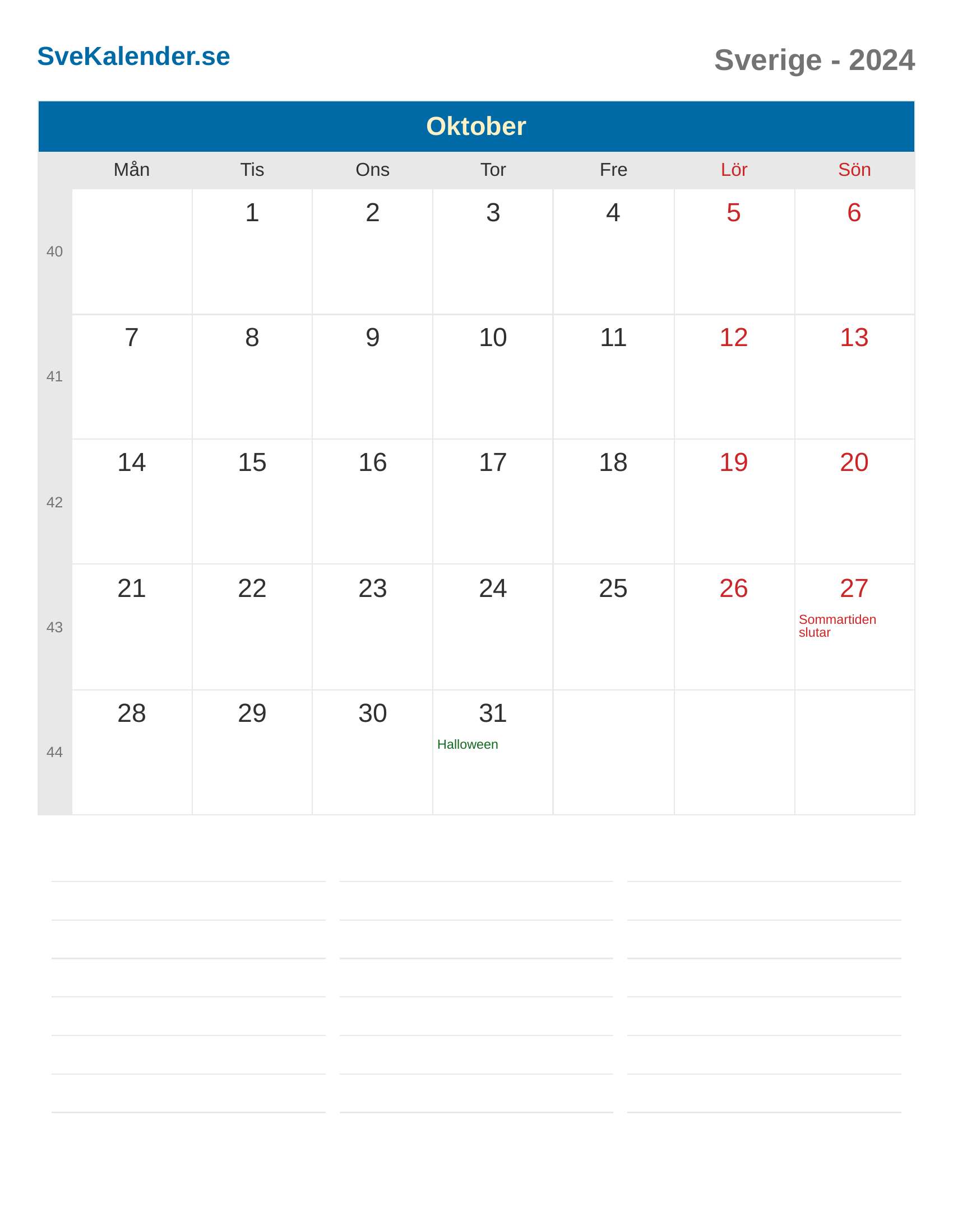 Oktober 2024 kalender - Sverige