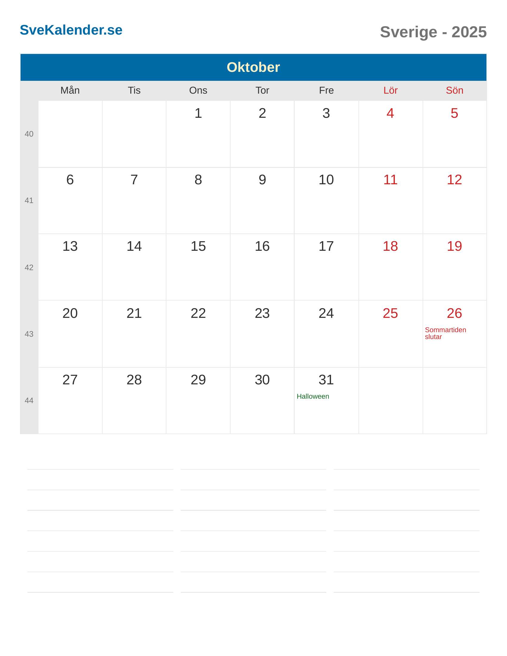 Oktober 2025 kalender - Sverige
