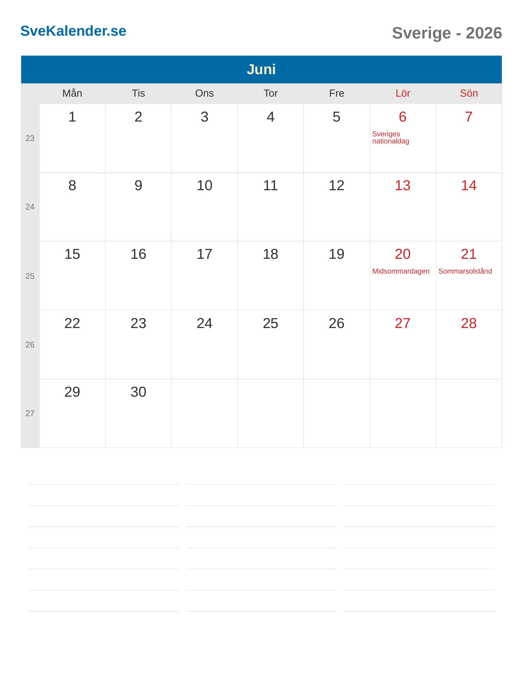 Juni 2026 kalender - Sverige
