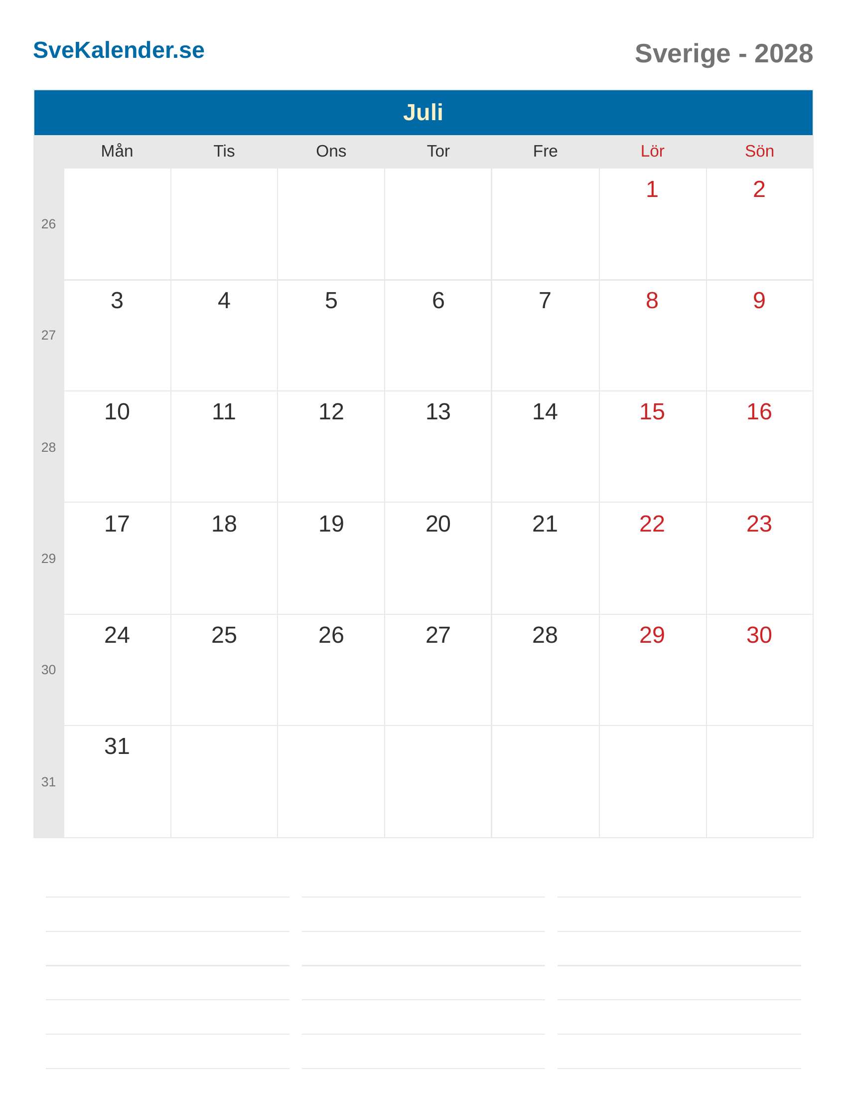 Juli 2028 kalender - Sverige
