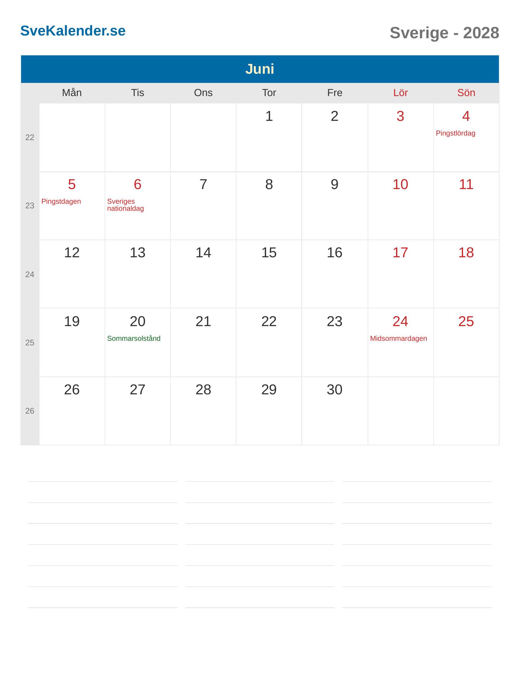 Juni 2028 kalender - Sverige