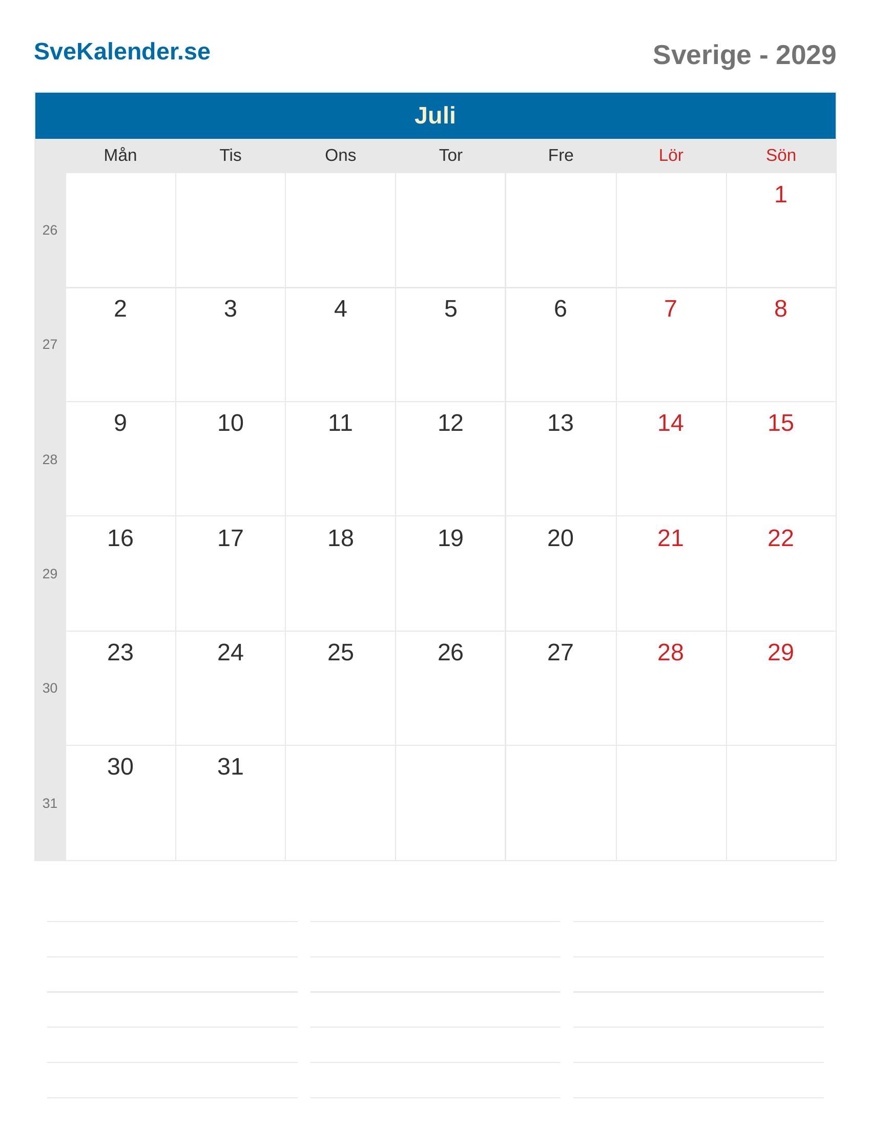 Juli 2029 kalender - Sverige