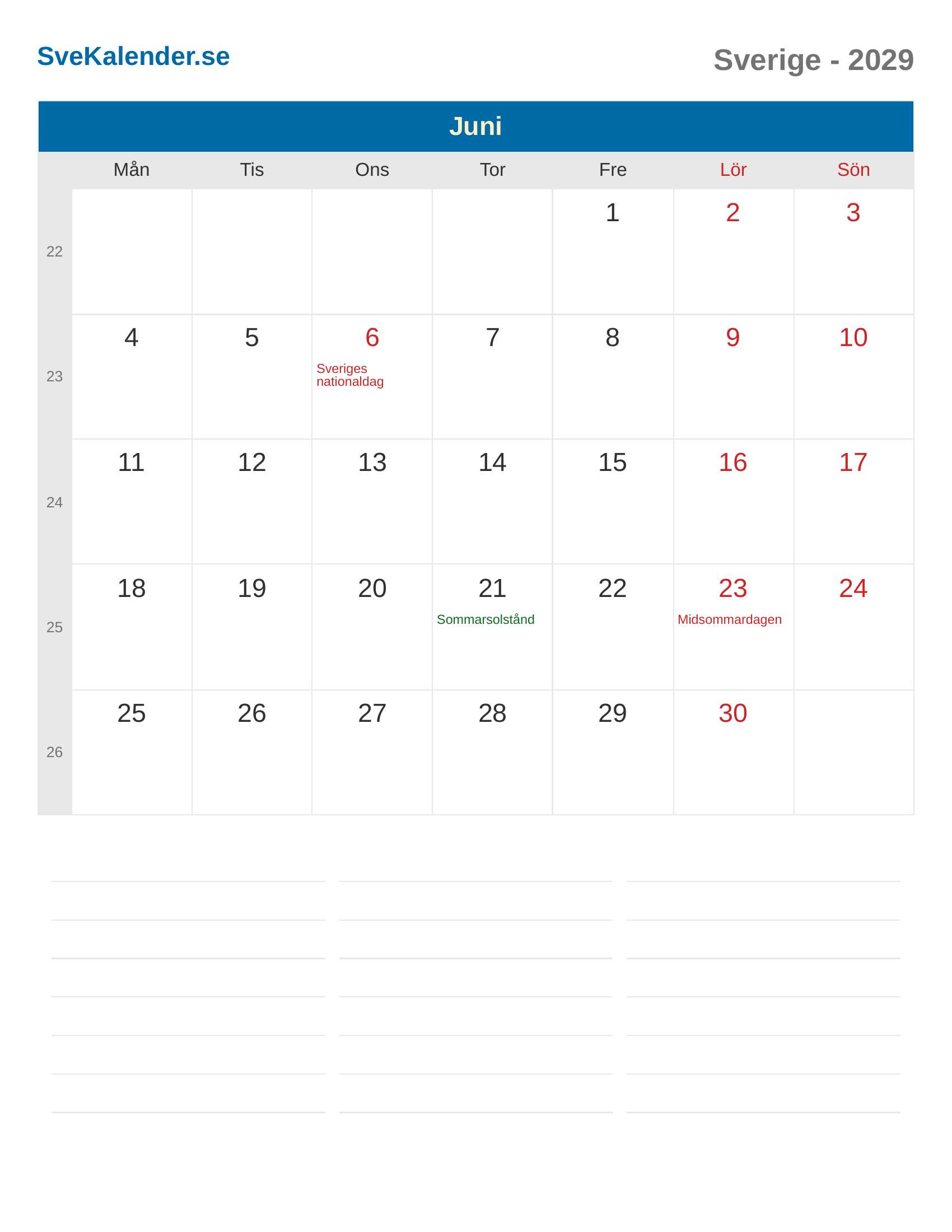 Juni 2029 kalender - Sverige