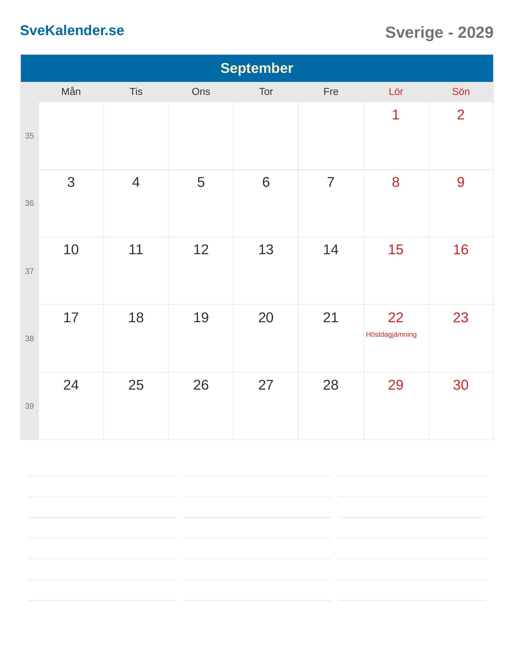 September 2029 kalender - Sverige